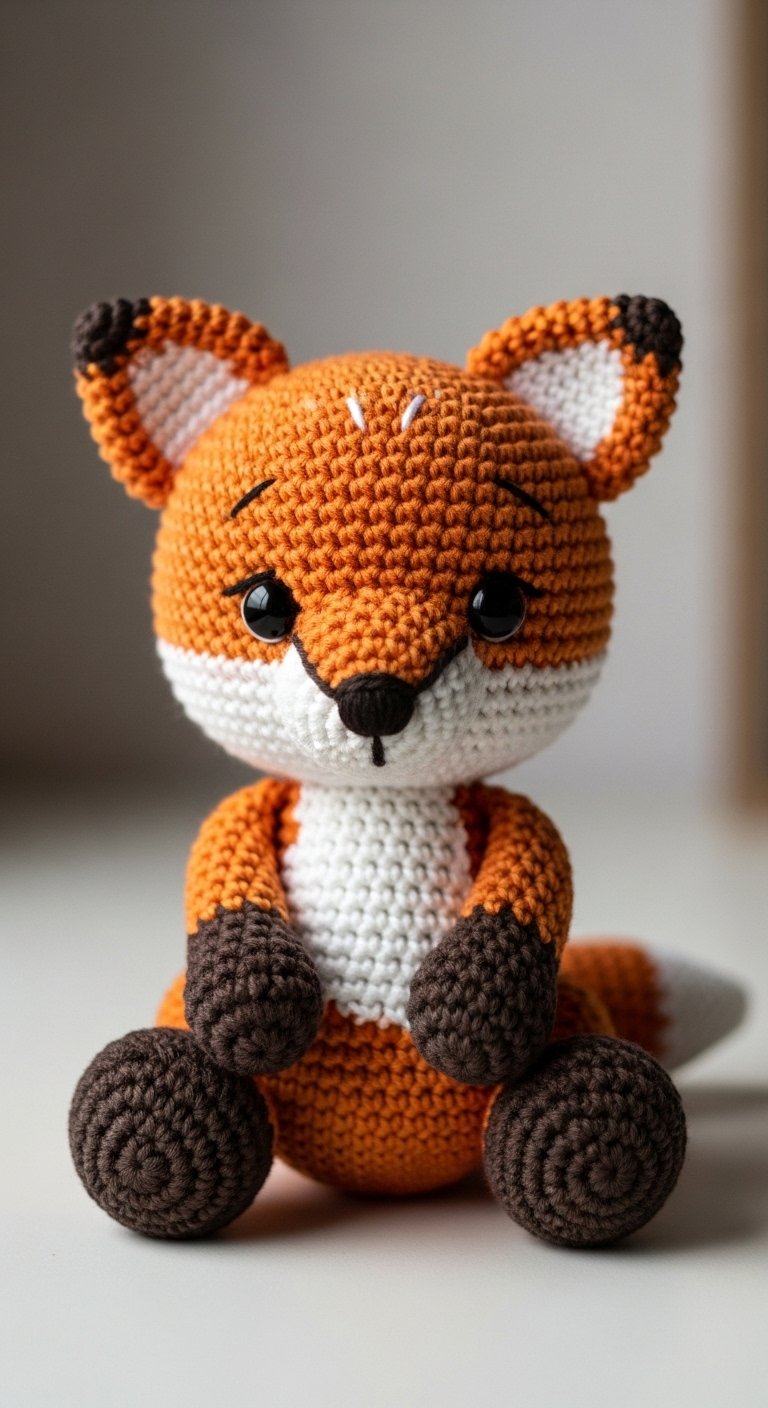 Orange yarn is a must for this woodland friend. The Fox Cub features a white-tipped tail and a pointed snout. It pairs beautifully with natural elements like wood and stone.