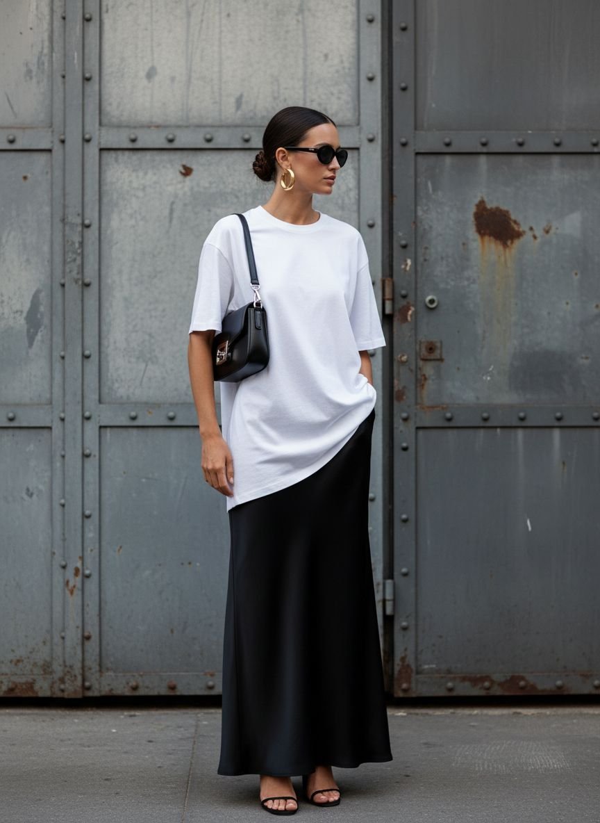 This combination captures the essence of “model off-duty” style. Pairing a refined black satin skirt with a slouchy, oversized white t-shirt brings an immediate sense of cool nonchalance. The design theory here is tension. You are mixing a casual, borrowed-from-the-boys item with a traditionally feminine, delicate bottom. This contrast signals that you care about style but you aren’t trying too hard. The matte cotton of the tee softens the shine of the satin, making the skirt appropriate for daytime errands or a casual lunch.