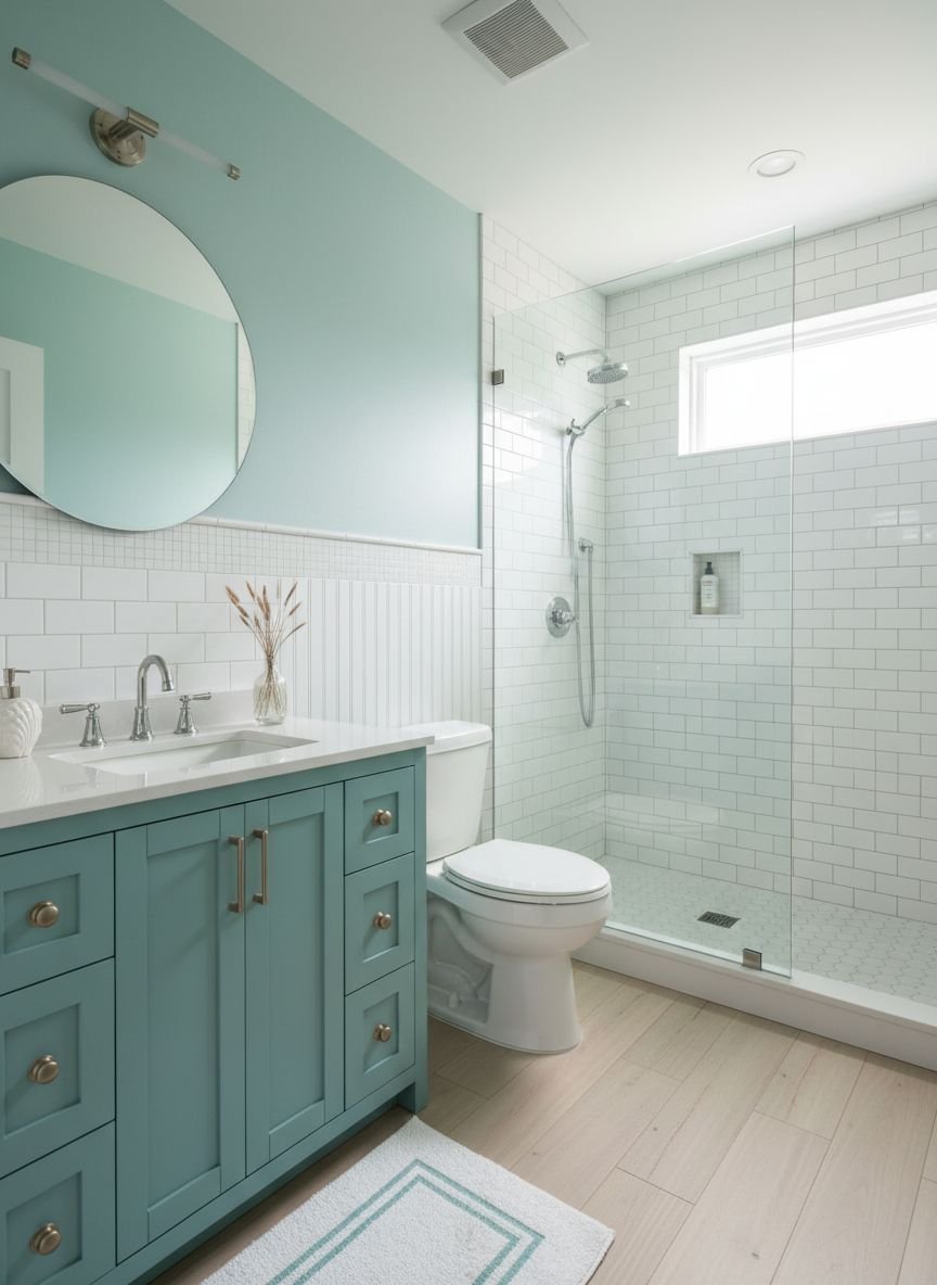 Pro Tip: Install a large, frameless mirror with integrated LED backlighting to amplify the modern vibe and ensure the teal tones look true to color.