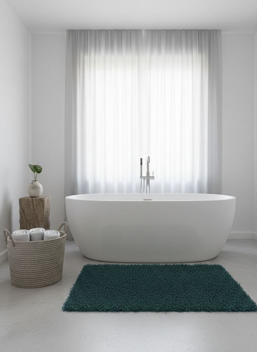 You can introduce teal through textiles and accessories. Swap out your shower curtain, bath mats, and towels for teal versions. Add teal ceramic vases, soap dispensers, or wall art. A large teal area rug can also cover neutral flooring to bring the color in from the ground up.