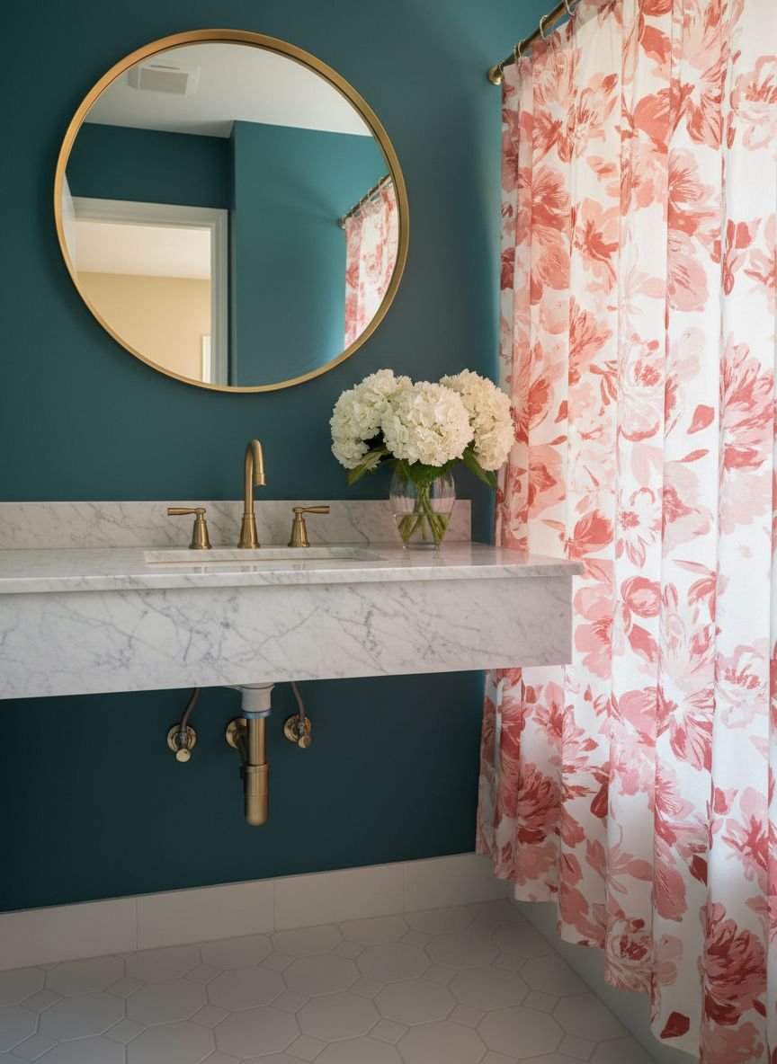 Take a trip to the tropics with an “Exotic Florals” theme. This style uses a vibrant, jungle-green teal as the base. It evokes the feeling of a lush rainforest. Pair this verdant color with live plants—ferns, pothos, and monsteras thrive in the humidity of a bathroom and look stunning against a teal backdrop.