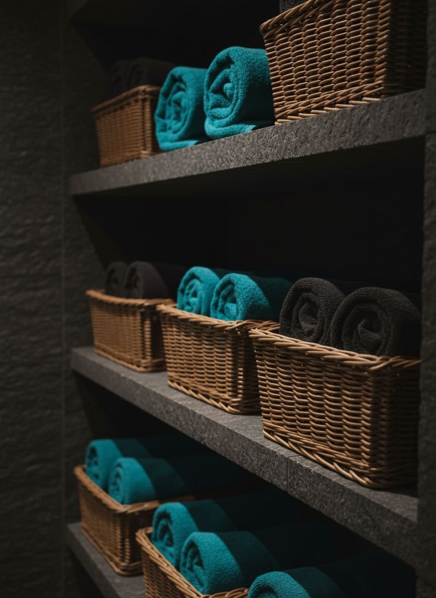 If you have teal walls, bright white towels create a classic, spa-like contrast. Mustard yellow towels add a fun, trendy pop of color. Grey towels offer a subtle, sophisticated look. Avoid matching the towels exactly to the wall color, as this can make the room feel flat.
