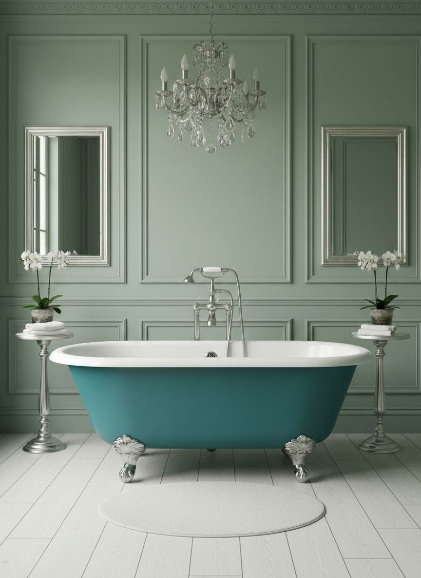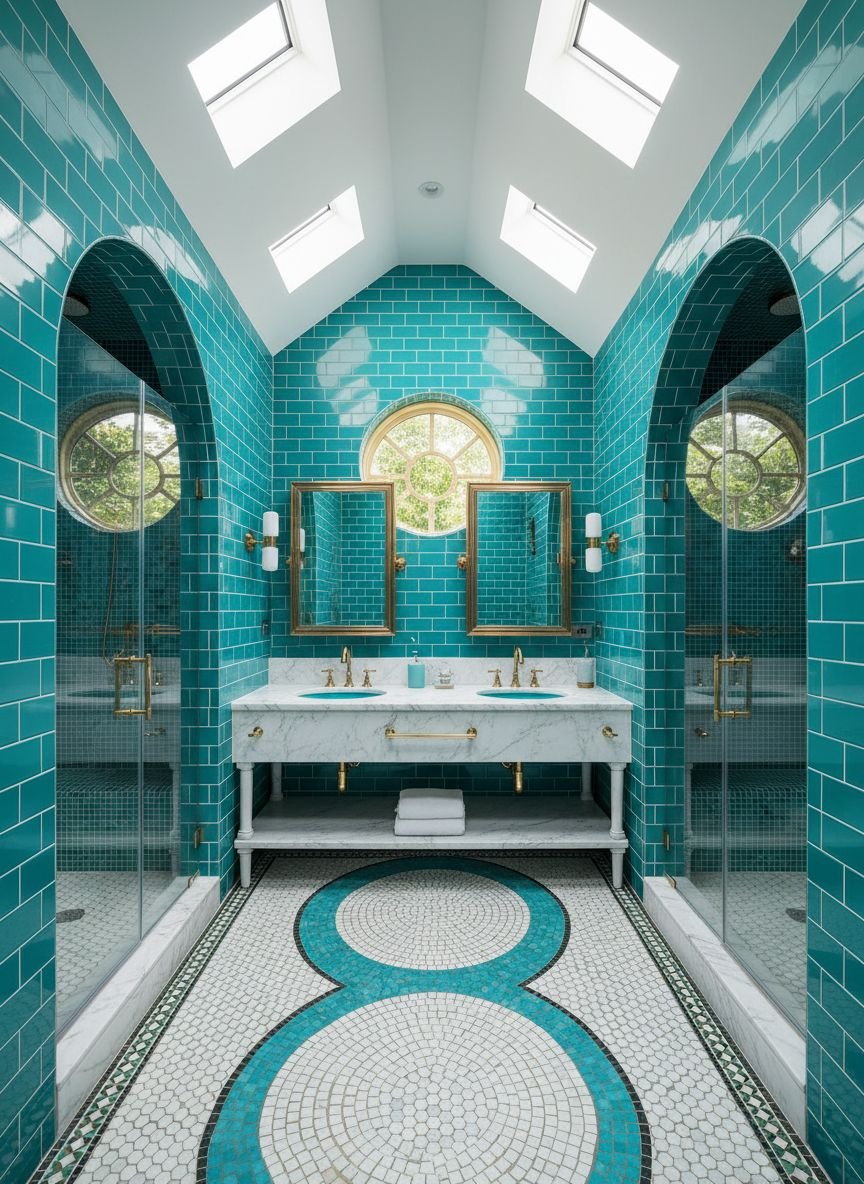 Inspired by the Art Deco architecture of New York City, this style combines dark, moody teal with geometric patterns and luxe finishes. Think Great Gatsby meets modern spa. Use a dark teal paint with a slight sheen or emerald-teal subway tiles. The defining feature of this look is the use of black and white geometric floor tiles (like basketweave or hexagon mosaics) and polished chrome or nickel fixtures.
