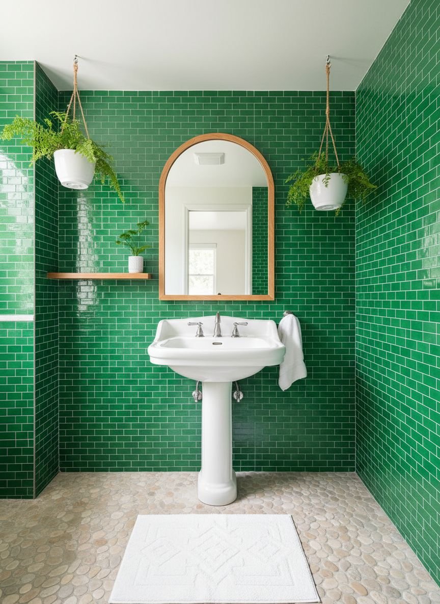 Channel the swinging sixties with a “Mod Squad” bathroom that embraces retro futurism. This look uses a vibrant, saturated teal paired with geometric shapes and stark contrasts. Think teal square tiles stacked vertically (rather than the traditional brick pattern) or a bold teal geometric wallpaper. The vibe is energetic, fun, and unapologetically bold. It is a style that works particularly well in powder rooms where you can afford to take more design risks.