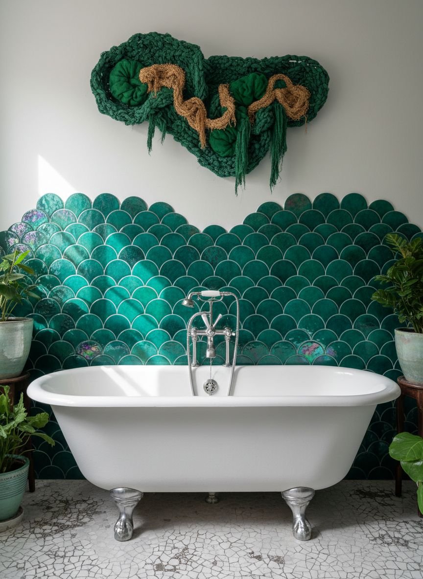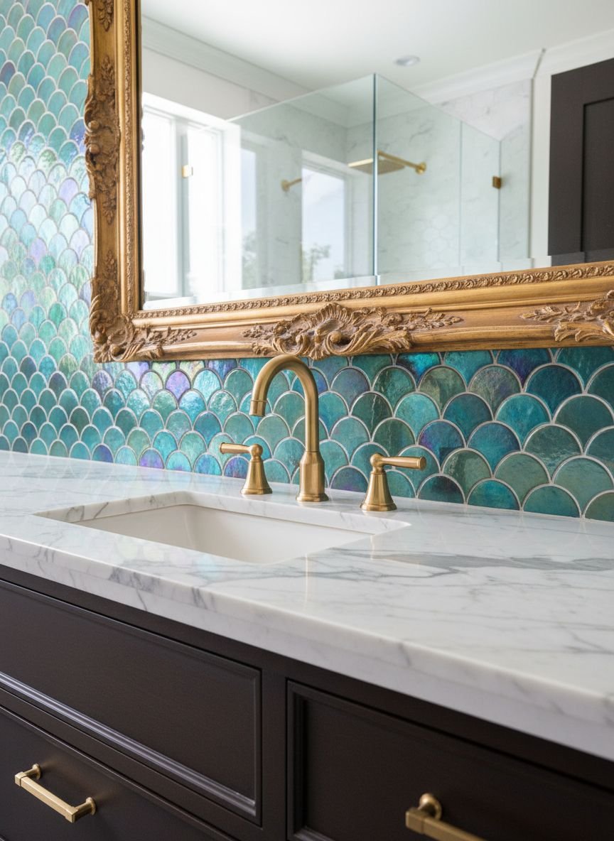 “Scale It Up” refers to playing with the size of your tiles, specifically using oversized teal tiles or “fish scale” (scallop) tiles to make a dramatic statement. Large-format teal porcelain slabs in a shower enclosure create a seamless, monolithic look that feels incredibly expensive and modern. Alternatively, using small, scallop-shaped tiles in a bright turquoise teal creates a playful, mermaid-esque texture that catches the light beautifully.