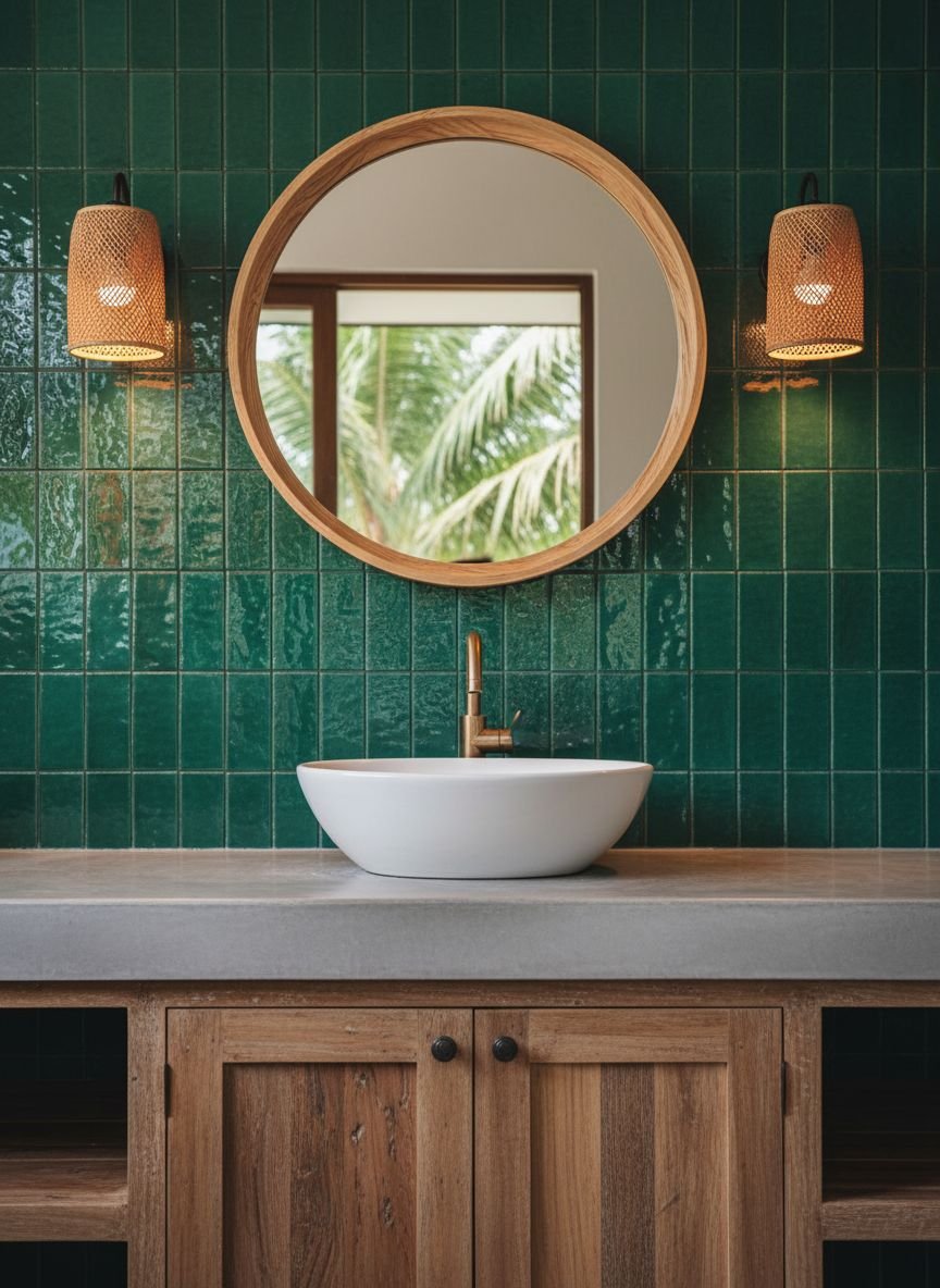 The design relies on biophilic principles, connecting the indoors with nature. Use bamboo or rattan accessories to enhance the tropical vibe. A shower curtain with a large palm leaf print can serve as a focal point if you are not ready to paint the walls. Gold fixtures add a touch of sunset warmth to the cool jungle tones. This look is energizing and fresh, making it a great space to start your morning.