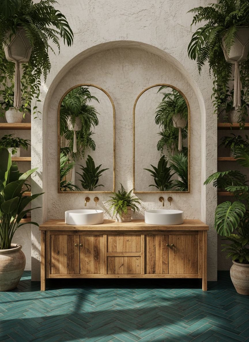 To achieve this look, consider a vanity made from repurposed barn wood set against a dark teal shiplap wall. Copper sinks and oil-rubbed bronze fixtures add to the rustic, lived-in feel. You might incorporate cowhide textures through a rug or a stool cover. The contrast between the cool, sophisticated teal and the warm, rough-hewn wood creates a balanced and inviting space that feels grounded and earthy.