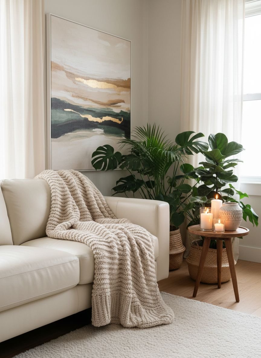- Texture over clutter: Use chunky knits, velvet, and boucle fabrics to add warmth without adding mess.