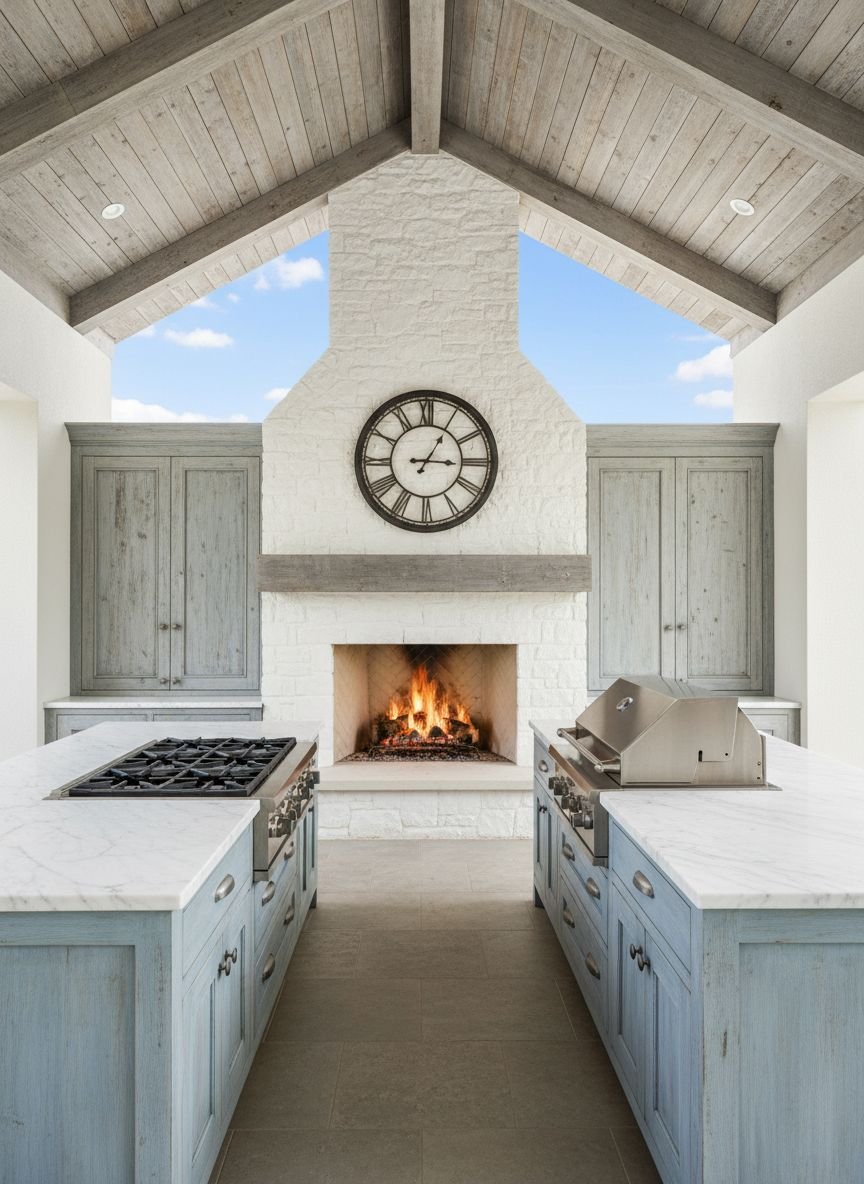 The modern farmhouse trend translates beautifully to outdoor spaces. This design relies on the classic combination of white shiplap (or weather-resistant siding) and red or whitewashed brick. The fireplace is typically a traditional brick structure, perhaps with a reclaimed wood mantel. The kitchen cabinetry might feature shaker-style doors in white or navy blue, topped with butcher block or soapstone counters.