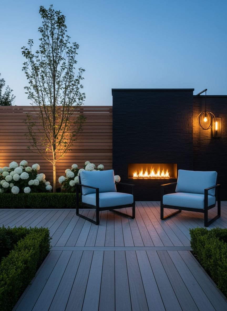 A pergola offers a lighter, airier alternative to a solid roof. While it doesn’t provide full rain protection (unless a polycarbonate sheet is added on top), it defines the space beautifully. Ideally, the fireplace is built into a privacy wall on one side of the pergola, creating a cozy “living room” feel. The slats of the pergola cast dynamic shadows during the day, adding visual interest.