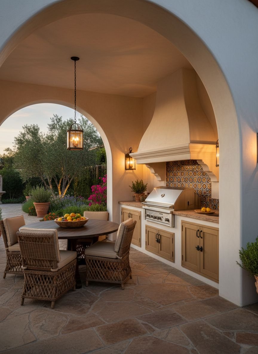 Transport yourself to the coast of Italy or Greece with a Mediterranean-style outdoor kitchen. This design is characterized by warm colors, terracotta tiles, and stucco finishes. Arched openings in the covered structure frame views of the garden, while the fireplace often features a curved, plaster design reminiscent of old-world ovens. Wrought iron details on light fixtures and furniture add a touch of intricate elegance.