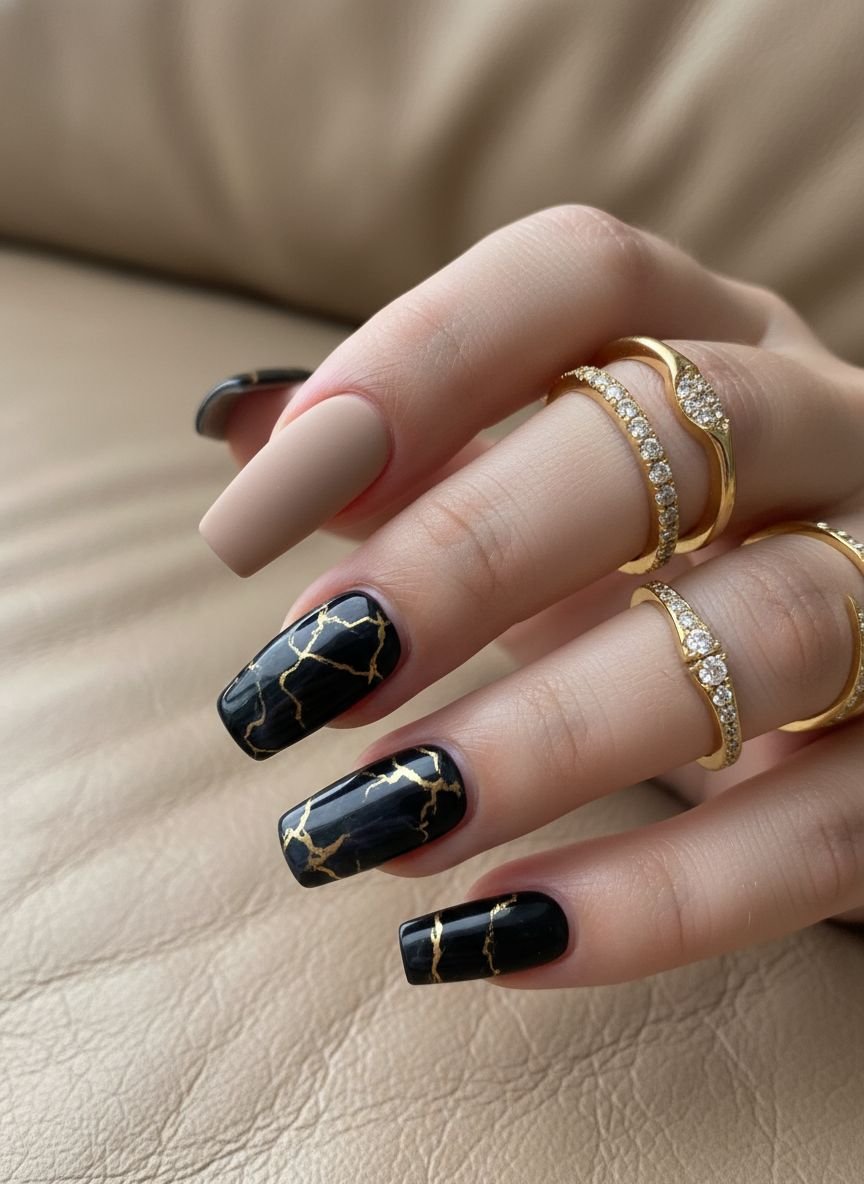 Golden Goddess is all about incorporating gold leaf and foil into a structured manicure. This isn’t about a solid gold glitter nail, which can look dated. Instead, it creates a “kintsugi” effect—the Japanese art of repairing broken pottery with gold. The look involves a milky or nude base with flecks of gold foil randomly dispersed or concentrated near the cuticle or tip. This creates a sense of organic luxury and texture that catches the light beautifully without being overpowering.
