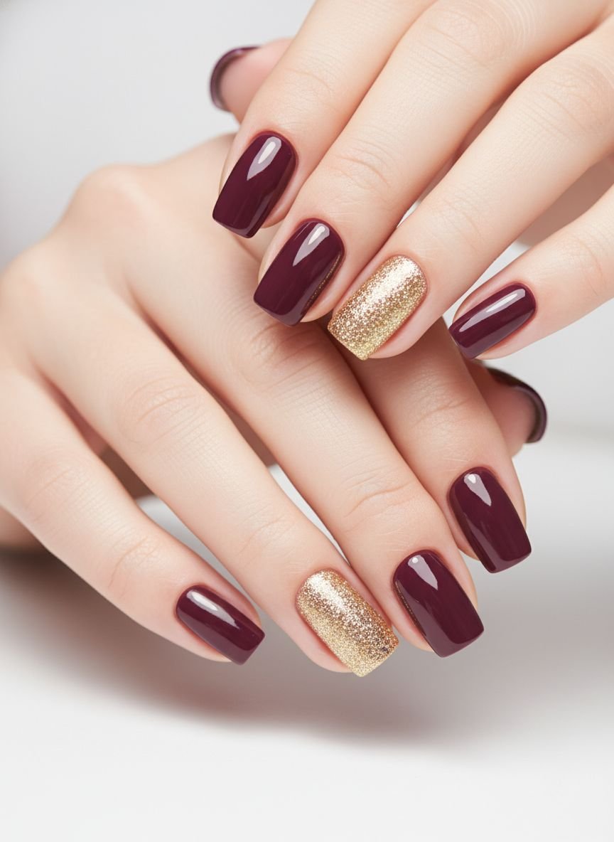 Burgundy Bliss is the deepest, darkest variation of the red trend, often referred to as “Black Currant” or “Plum Noir.” It is so dark it almost looks black, but in the light, you catch that rich, bloody red or purple undertone. This is the ultimate “Femme Fatale” look. It is dramatic, glossy, and incredibly high-fashion. In 2026, this shade is being paired with short, impeccably groomed nails to balance the drama of the color.