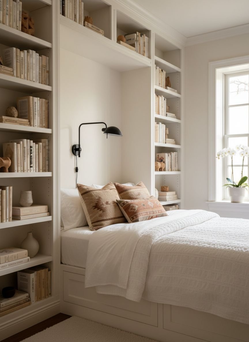Distinct from a full reading wall, targeted built-in bookshelves can flank a window, a door, or the bed itself. These narrower vertical columns of storage maximize awkward slivers of wall space. They draw the eye upward. This emphasizes the ceiling height and makes the room feel taller. You can use these shelves to store folded items like t-shirts or jeans if you lack dresser space.