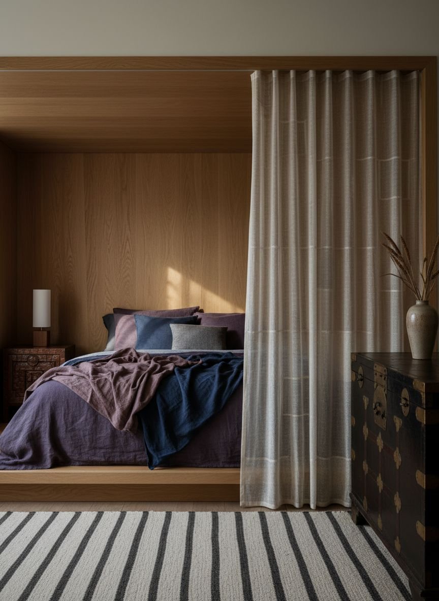 If you do add fabric, keep it sheer and light. A simple white voile draped over the top rail softens the look and adds a touch of romance. This frame-within-a-room creates a cozy “zone” for sleeping, even in a large, open-concept space.