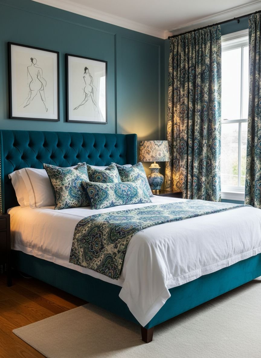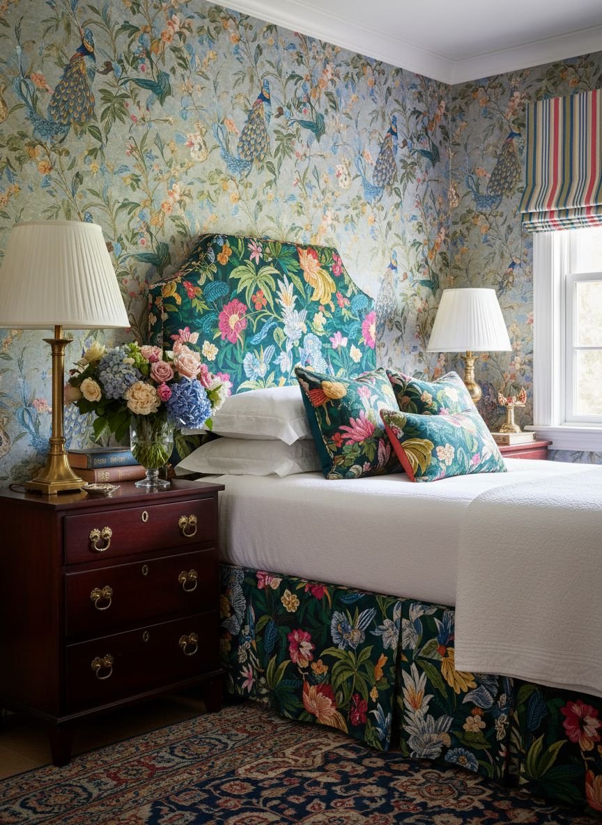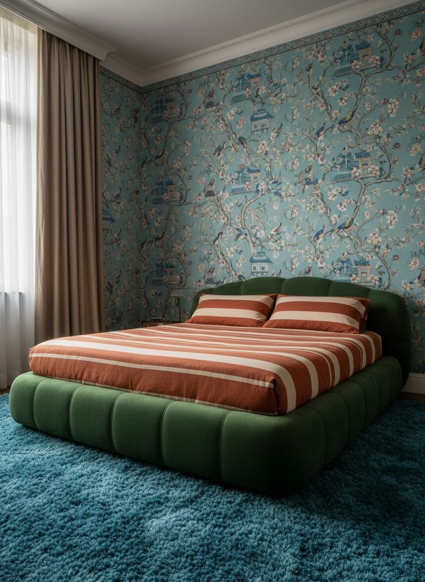 Furniture in a maximalist room should have personality. A velvet emerald green bed or a mustard yellow accent chair can serve as the anchor. The key to keeping it “modern” rather than “messy” is to maintain a consistent color thread. If your wallpaper has pink and green, ensure your rug and bedding pick up those exact shades. This ties the visual elements together.