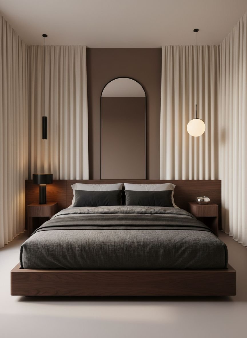 Lighting plays a major role in this aesthetic. Instead of standard table lamps, install pendant lights that hang low over the nightstands. This frees up surface area and draws the eye upward, making the ceiling feel higher. Keep the color palette monochromatic but play with sheen—matte walls against glossy ceramic vases create a sophisticated visual rhythm.