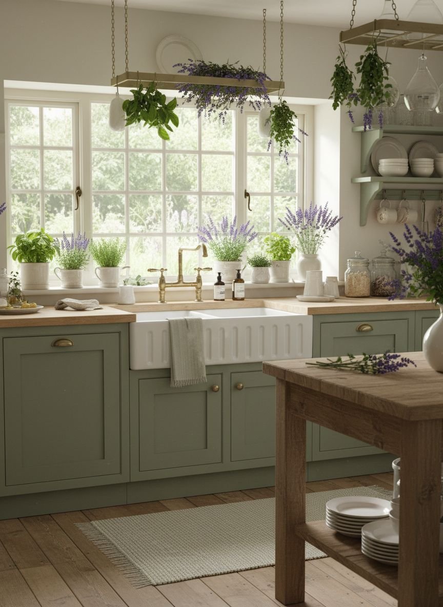 Use sage green cabinets paired with butcher block countertops for a farmhouse vibe