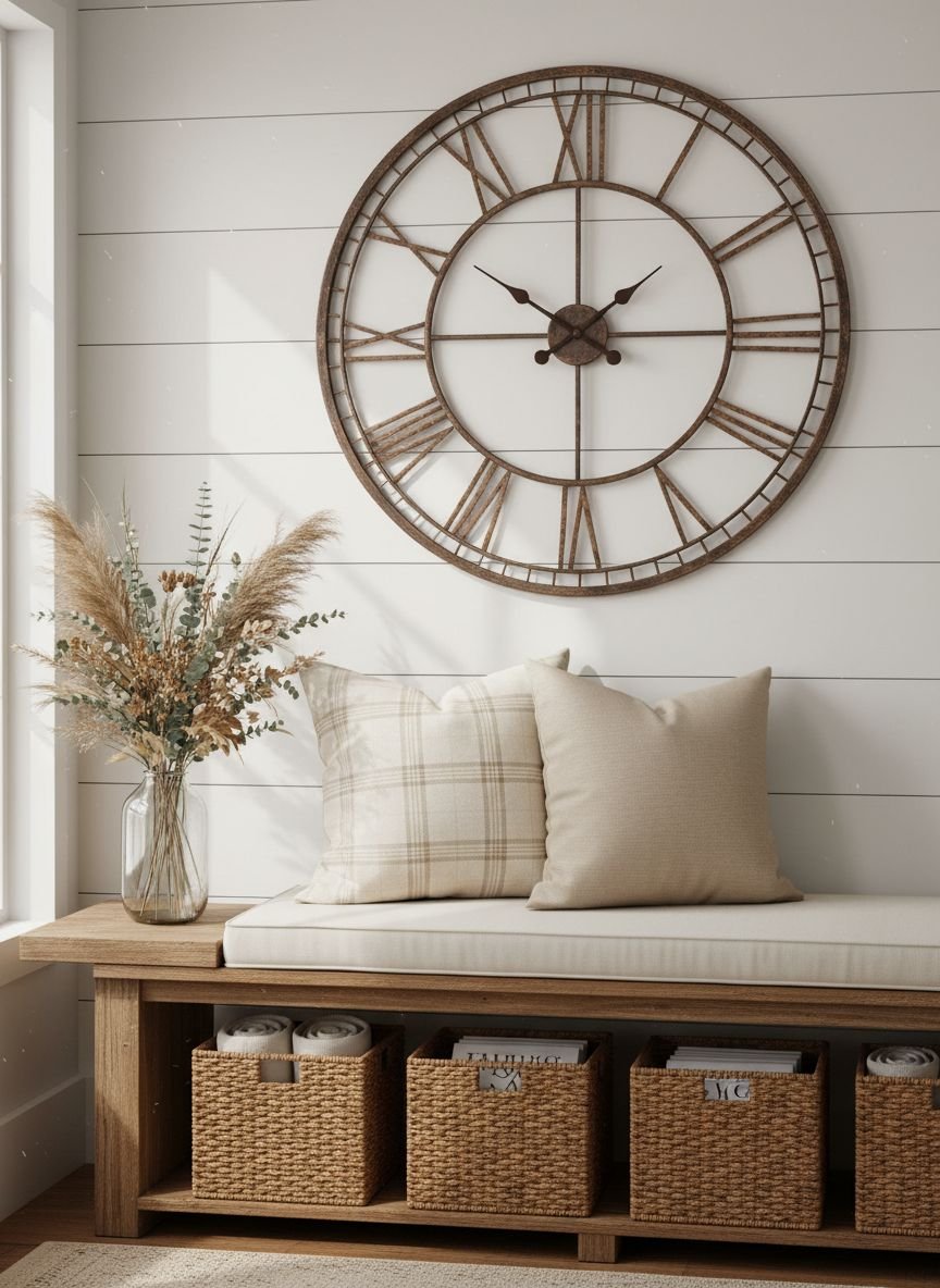 Look for a clock with a distressed metal or wood frame and Roman numerals. The large scale acts as art, anchoring the space. Position a cozy sitting bench underneath the clock, layered with pillows and a throw blanket. This creates a functional “drop zone” in an entryway or a mudroom, combining the utility of the bench with the visual impact of the wall decor.