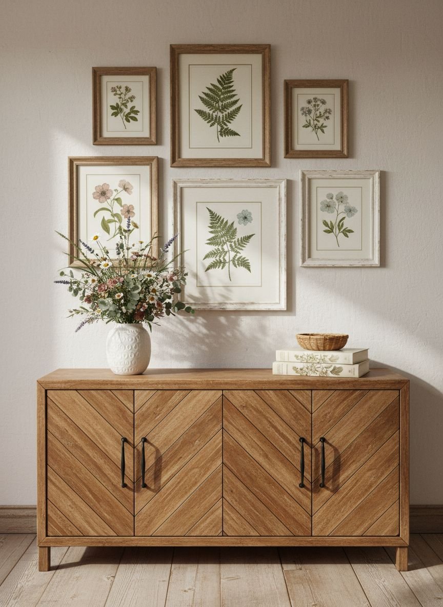 Choose prints that feature local flora, ferns, or herbs to maintain an authentic country feel. When framing, avoid sleek modern materials. Instead, scour thrift stores for wooden frames in varying shades of oak, walnut, and distressed white. The mismatched wood tones add warmth and texture to your walls. Arrange them in a loose, organic cluster rather than a rigid grid. This approach feels more relaxed and lived-in, which is the heart of country style.
