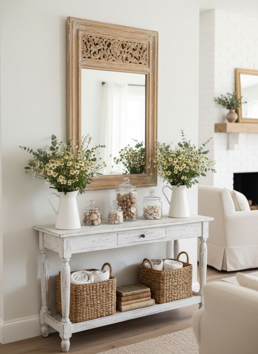 Beneath the mirror, place a console table with a weathered finish. You can achieve this look with chalk paint and some sandpaper if you don’t have a vintage piece. The reflection from the mirror bounces light around the space, making narrow hallways feel larger and brighter. Style the table with a simple ceramic bowl for keys and a tall vase of branches to add height and life.