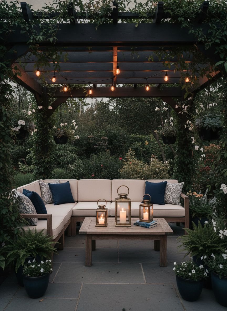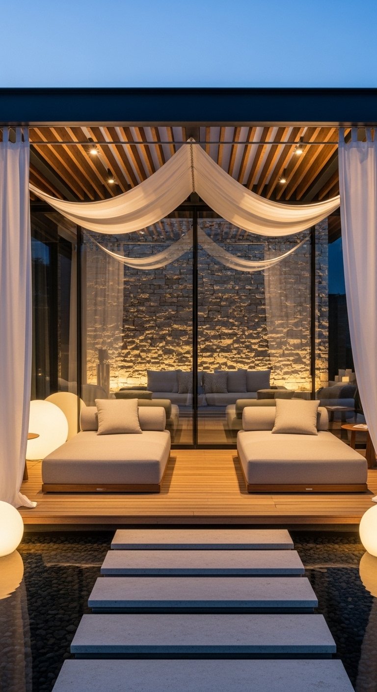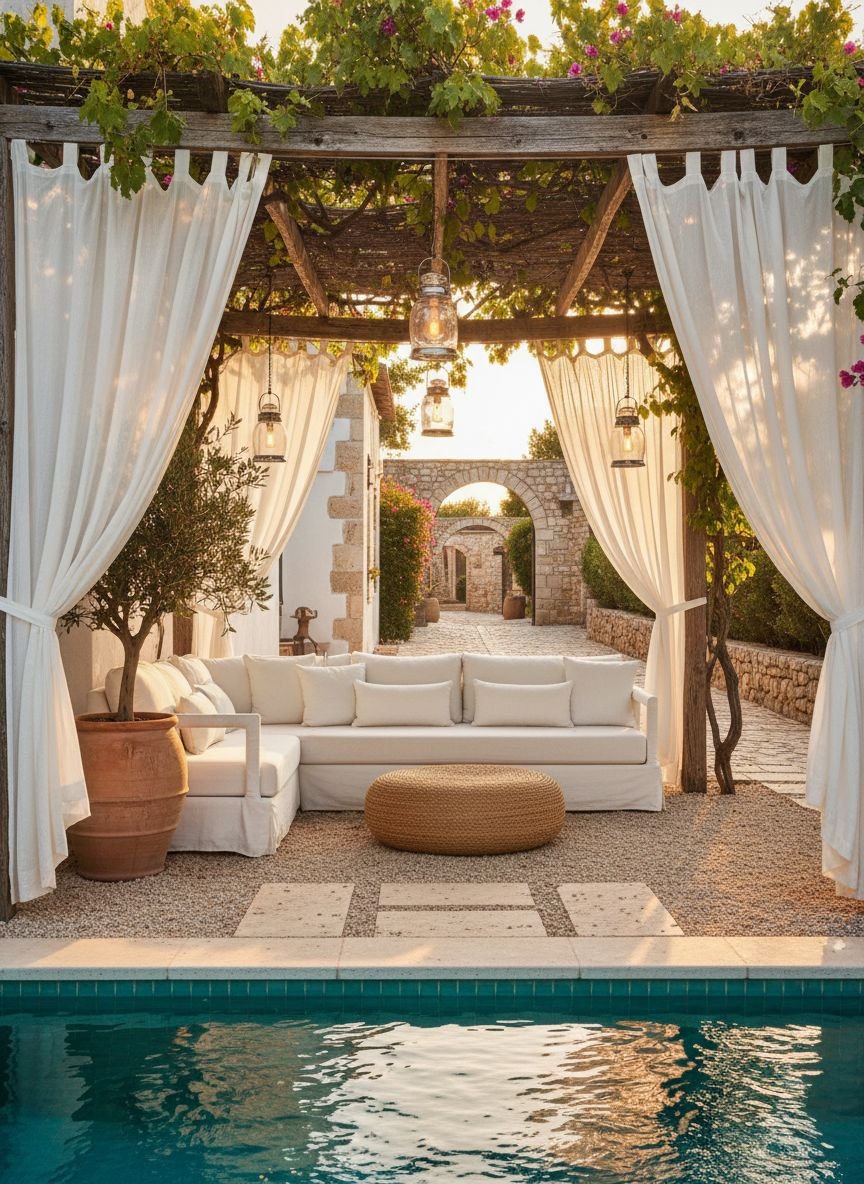 Softening the hard lines of a wooden pergola with draped fabric creates a resort-like cabana feel right in your backyard. This style uses long, flowing panels of outdoor fabric woven through the roof beams of a pergola structure. The fabric hangs in gentle swoops or “billows,” adding texture and movement when a breeze passes through. The contrast between the rigid, dark-stained timber and the soft, white or beige cloth creates a sophisticated visual balance that feels both grounded and airy.