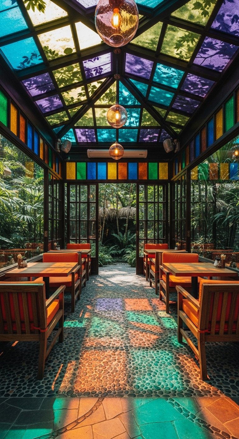 The interplay of color and light adds a spiritual or whimsical quality to the space. It turns a standard afternoon sitting area into a destination. Modern materials like colored polycarbonate offer this look without the fragility and weight of traditional leaded glass, making it safer and more affordable for overhead applications.