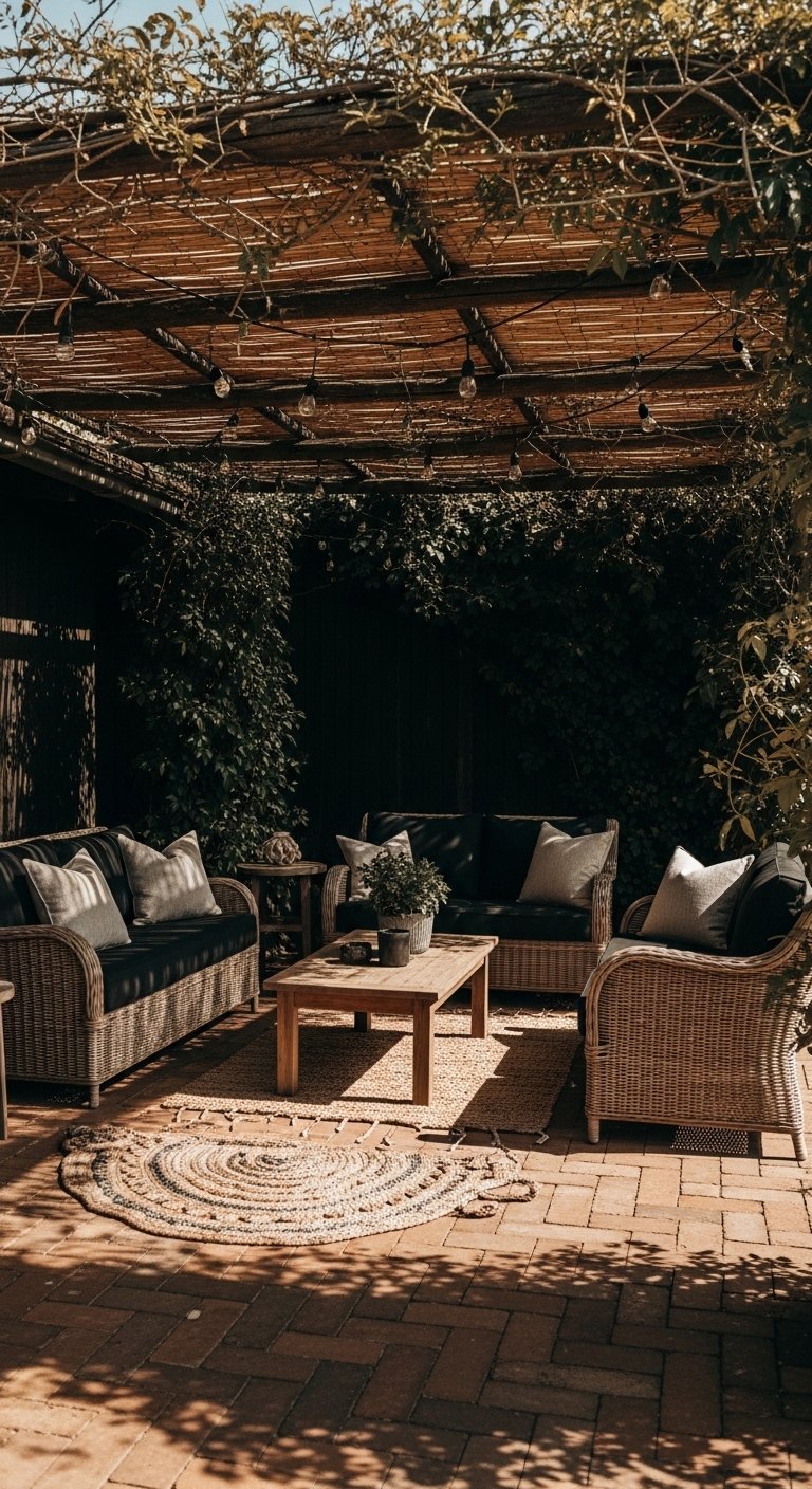 Woven willow or hazel hurdles can be used horizontally to create a dappled shade structure that feels ancient and organic. This technique, often used in English cottage gardens, involves weaving flexible branches through a framework. The result is a textured, semi-permeable roof that filters sunlight into intricate patterns. It creates a rustic, woodland feel that is incredibly grounding.