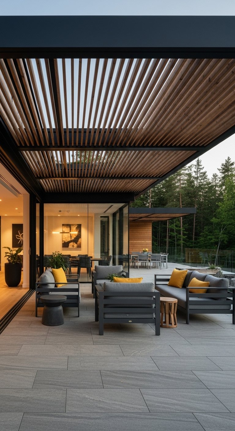 This architectural approach is visually lighter than a solid roof. It defines the space without enclosing it. It is excellent for modern minimalist homes where clean lines are essential. The gaps between the floating panels allow for heat escape and keep the patio feeling connected to the open sky.