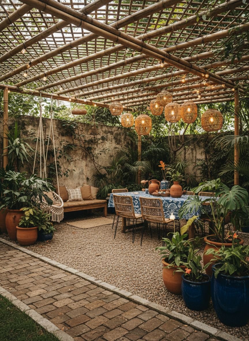 • For Boho Vibes: Bamboo fencing rolls, bistro string lights, macramé hanging planters.