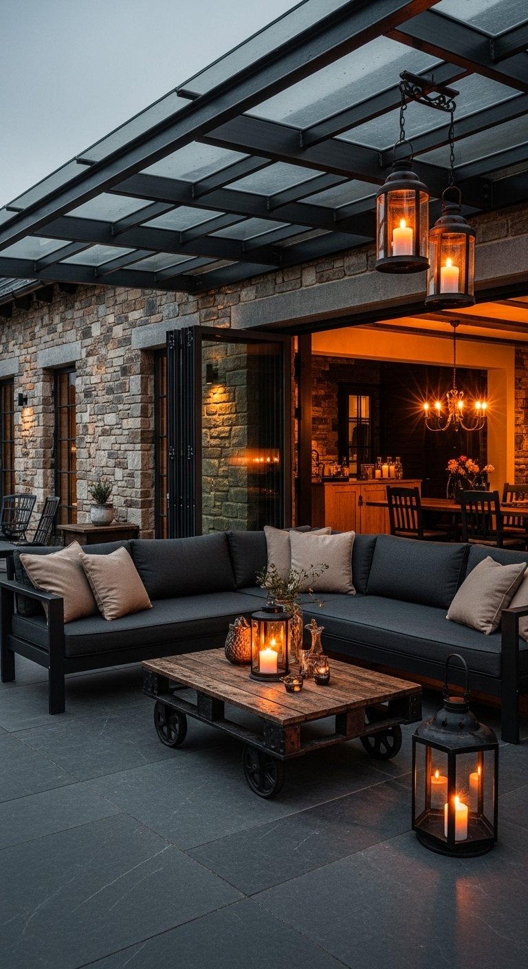 Industrial design embraces raw materials and structural honesty. An industrial patio roof typically features corrugated metal sheets, exposed steel I-beams, and chunky hardware. The look is rugged, durable, and effortlessly cool. It pairs perfectly with brick exteriors, concrete patios, and minimalist furniture. The corrugated metal is incredibly weather-resistant and sheds water efficiently, making it a practical choice for rainy climates.