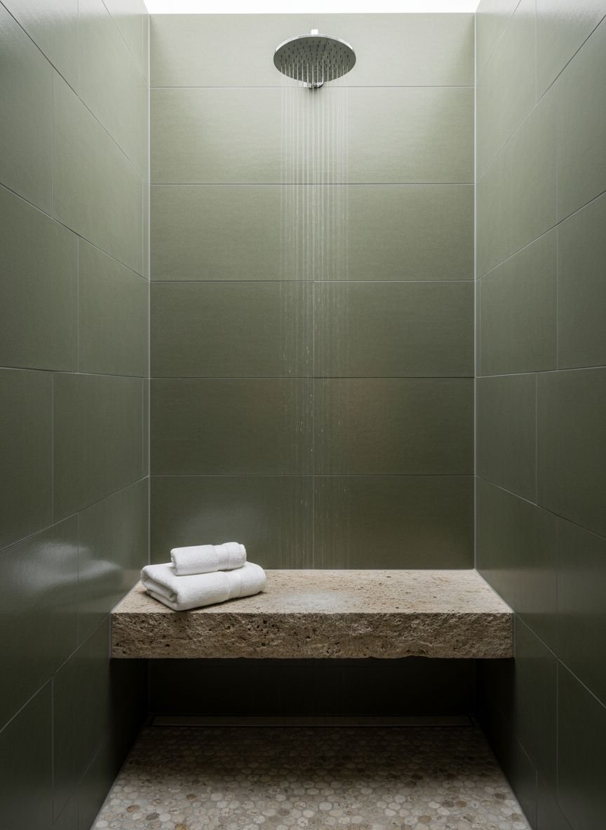 Monochromatic does not mean boring. It means using a single color in various shades and textures. A stunning example is an all-green shower: emerald glazed tiles on the walls, a mossy matte mosaic on the floor, and a sage green ceiling. This creates a cocoon-like effect that is incredibly soothing. The variation in texture—glassy, matte, rough—keeps the eye interested despite the lack of color contrast.