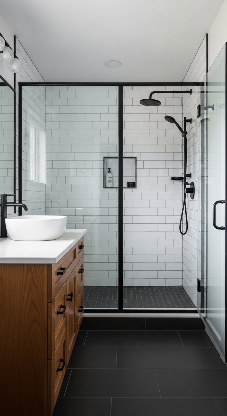 For small showers, you generally have two great options. Large-format tiles (like 12×24 inches) are excellent because they have fewer grout lines, which reduces visual clutter and makes the space feel expansive. Alternatively, vertical stacked tiles draw the eye upward, making low ceilings feel higher. Avoid medium-sized square tiles, which can make a grid pattern that boxes the room in.