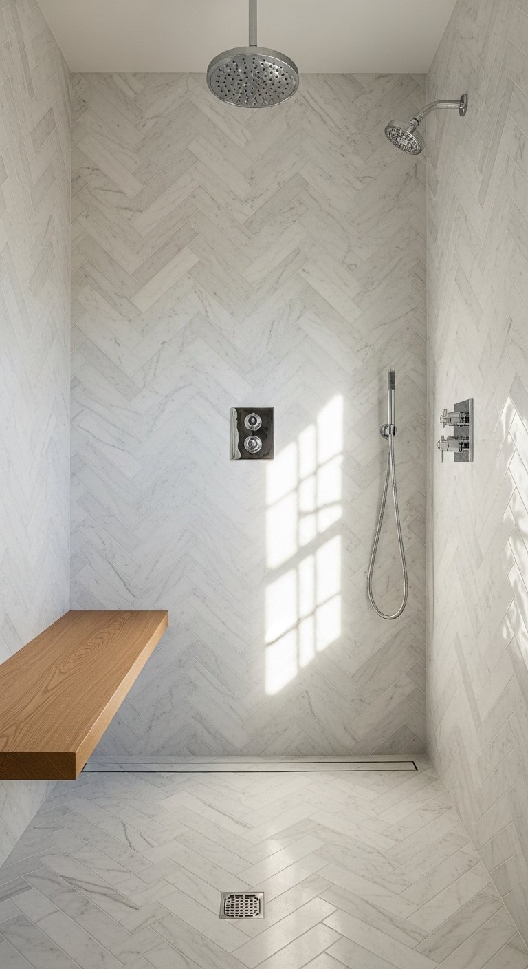 The herringbone pattern is a classic layout that instantly elevates simple rectangular tiles. By laying tiles at a 90-degree angle to each other, you create a zigzag pattern that suggests movement and energy. A popular combination is a marble herringbone floor paired with large horizontal plank tiles on the walls. The busy floor pattern hides potential slips and stains, while the calm walls keep the space open.