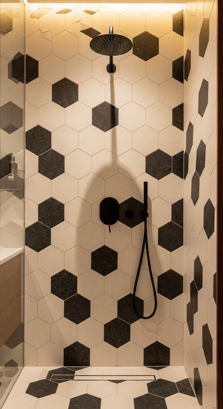 Hexagons are nature’s perfect shape, and they look stunning in a shower. A trending combination is “hex on hex,” using large hexagonal tiles on the walls and smaller mosaic hexagons on the floor. To define the zones, you might use a light marble hex on the wall and a dark slate hex on the floor. The repetition of the shape creates a satisfying geometric harmony.