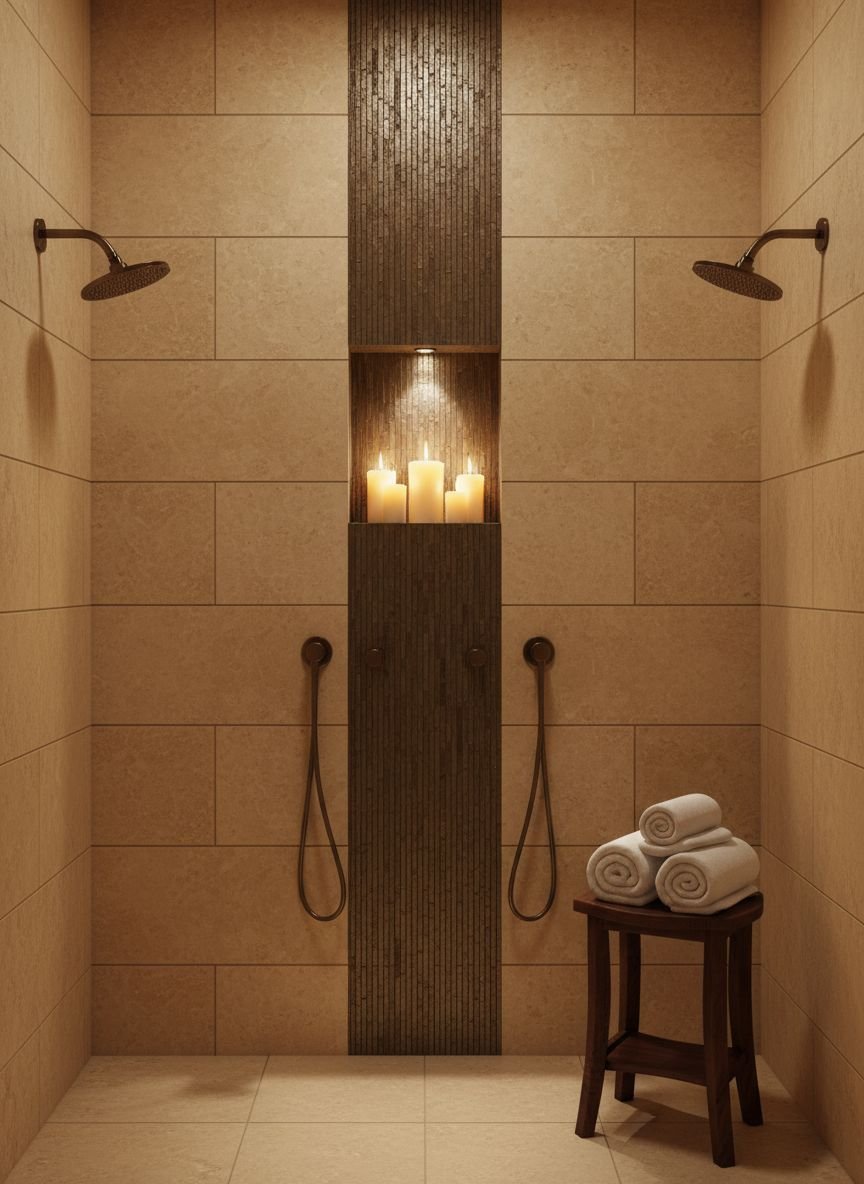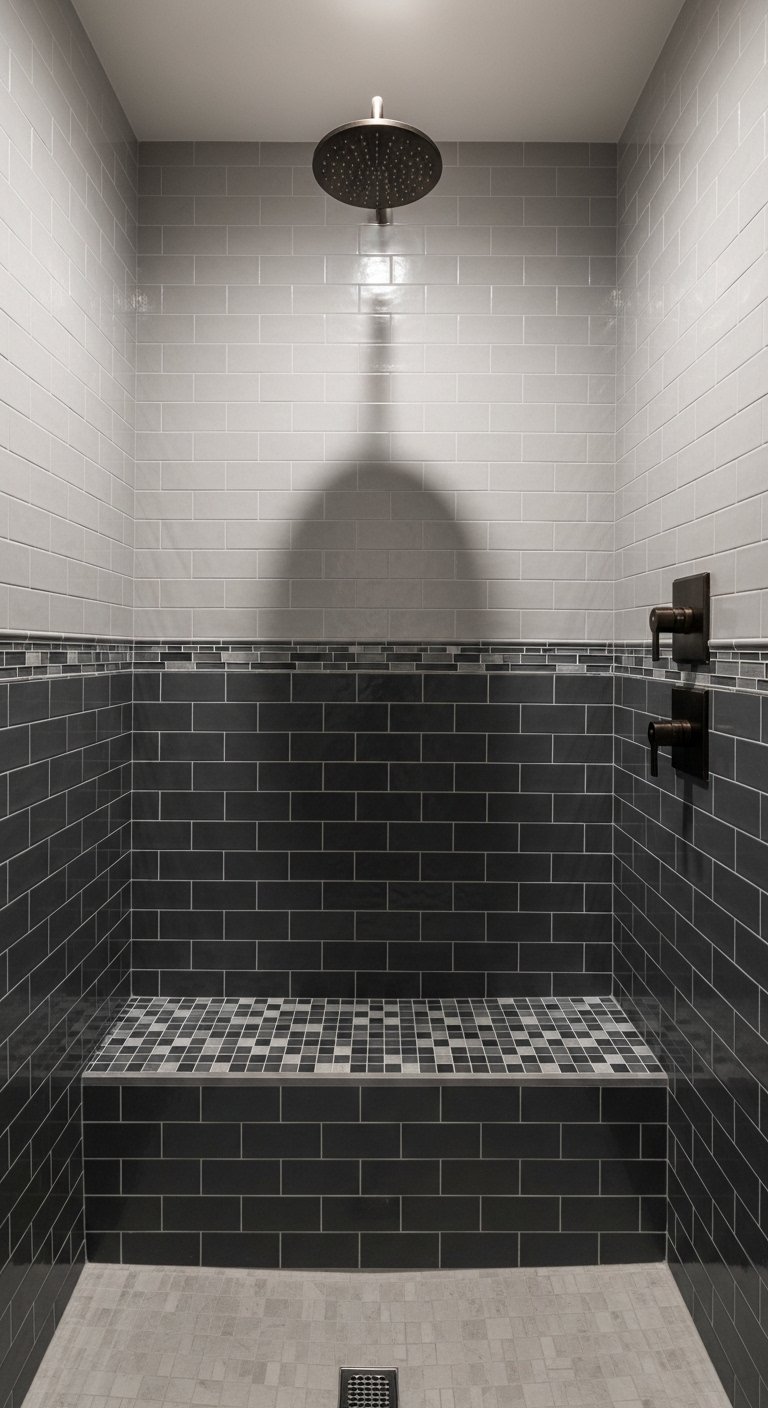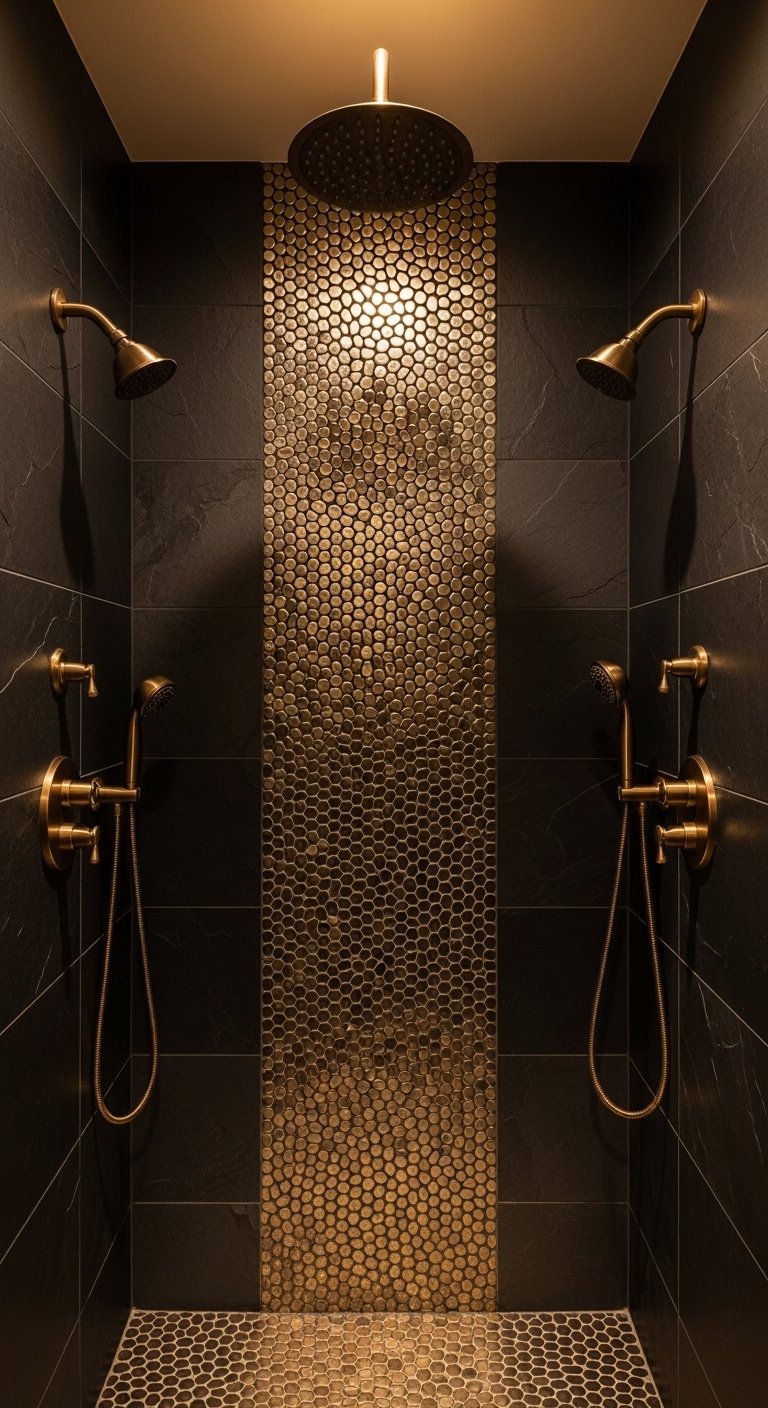 For a touch of glamour, metallic accents are the way to go. This doesn’t mean tiling your whole shower in gold (unless you want to!). Instead, it involves using metal strip inlays or metallic-finish glass tiles as a border or niche backing. Pair these shimmering accents with matte black or dark grey stone tiles. The contrast between the dull, dark stone and the shiny metal creates a luxurious, moody aesthetic.