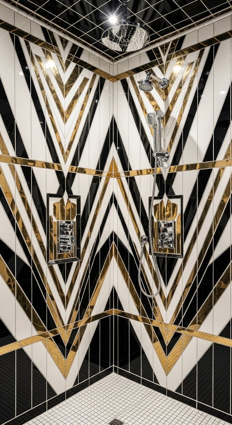 Art Deco is all about glamour, symmetry, and bold geometry. To recreate this 1920s vibe, combine black and white tiles with gold accents. Think fan-shaped (fish scale) tiles in a glossy finish on the walls, paired with a checkerboard floor. The fan shape evokes the classic Deco arch, while the black and white palette remains timeless.