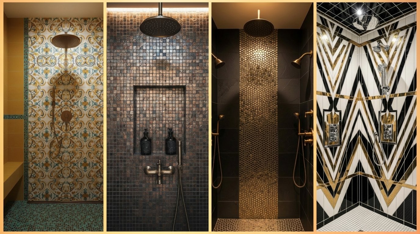 This style is perfect for vintage homes or for adding a touch of drama to a powder room shower. It feels curated and expensive. Finish the look with brass fixtures and perhaps a frosted glass shower door with a geometric motif.