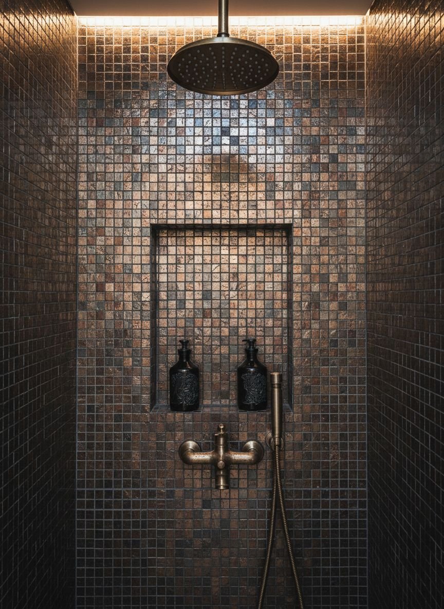 A mosaic medley is perfect for those who view the shower as a focal point rather than just a functional space. This approach often features a “feature wall” of intricate glass or stone mosaics, framed by larger, quieter tiles on the side walls. The small scale of mosaic tiles allows for complex storytelling through color and shimmer, acting almost like a piece of art within the shower enclosure. It is particularly effective in small showers where you want to add personality without overwhelming the room with large patterns.