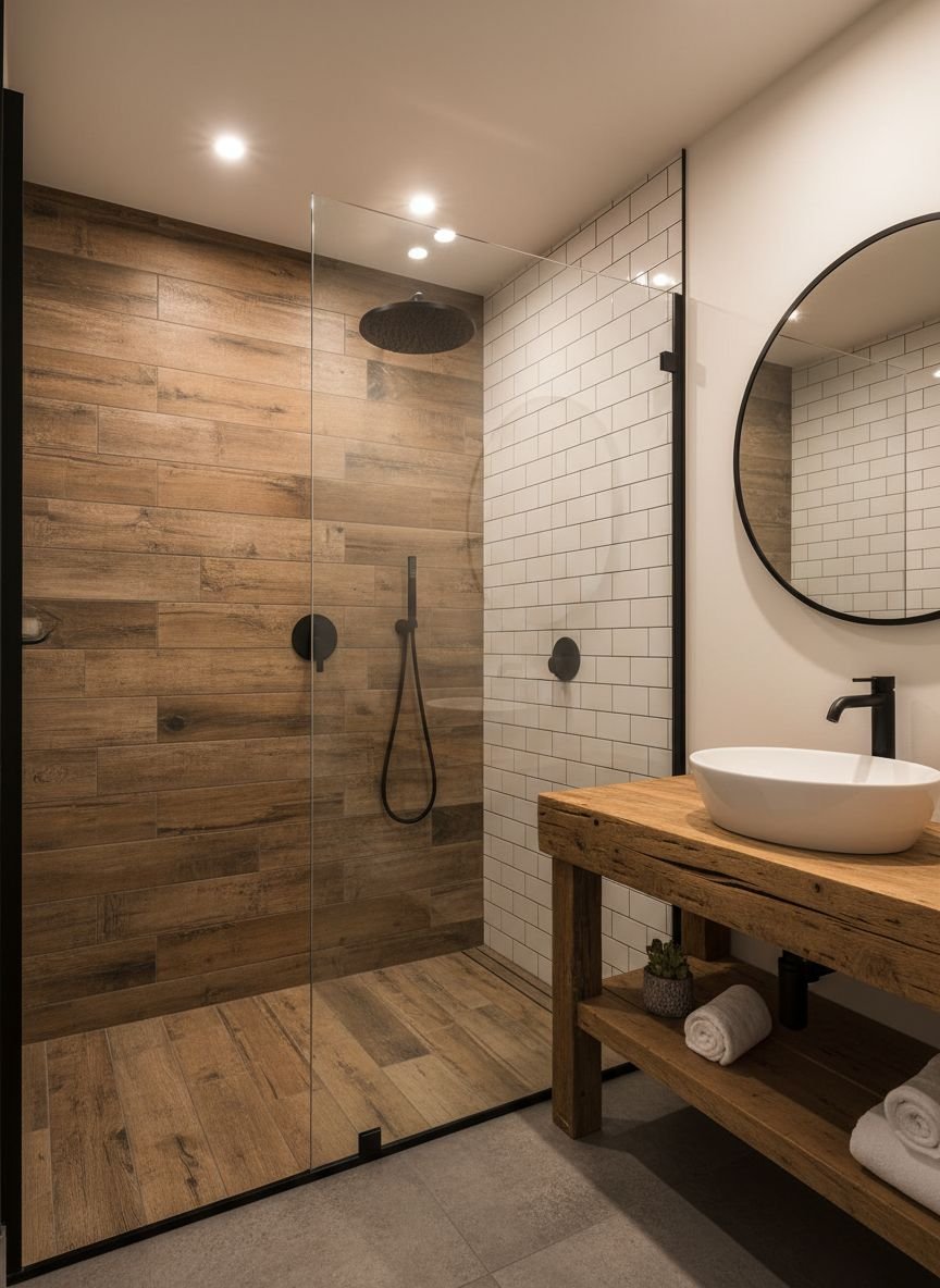 Bringing the warmth of wood into a wet environment was once a recipe for disaster, but wood-look porcelain tiles have revolutionized bathroom design. This combination pairs the rustic, spa-like vibe of wood grain with the clean, sanitary feel of white subway tiles. It creates a “Scandi-Spa” aesthetic that is incredibly popular for its calming properties. The wood tiles are often used on the shower floor or as a vertical accent strip, grounding the airy white walls with earthy texture.