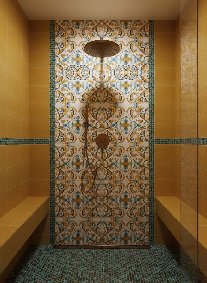 Pro Tip: Vary the scale of the tiles significantly (e.g., tiny mosaics vs. large slabs) to prevent the room from looking like a public pool.