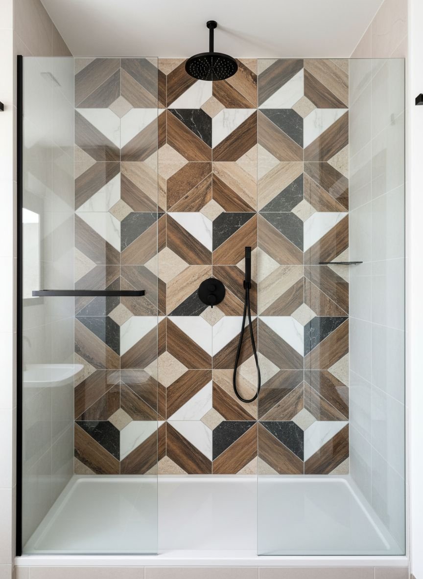 Pro Tip: When using a bold geometric pattern, keep your shower fixtures simple and streamlined (like chrome or matte black) so they don’t compete with the tile design.