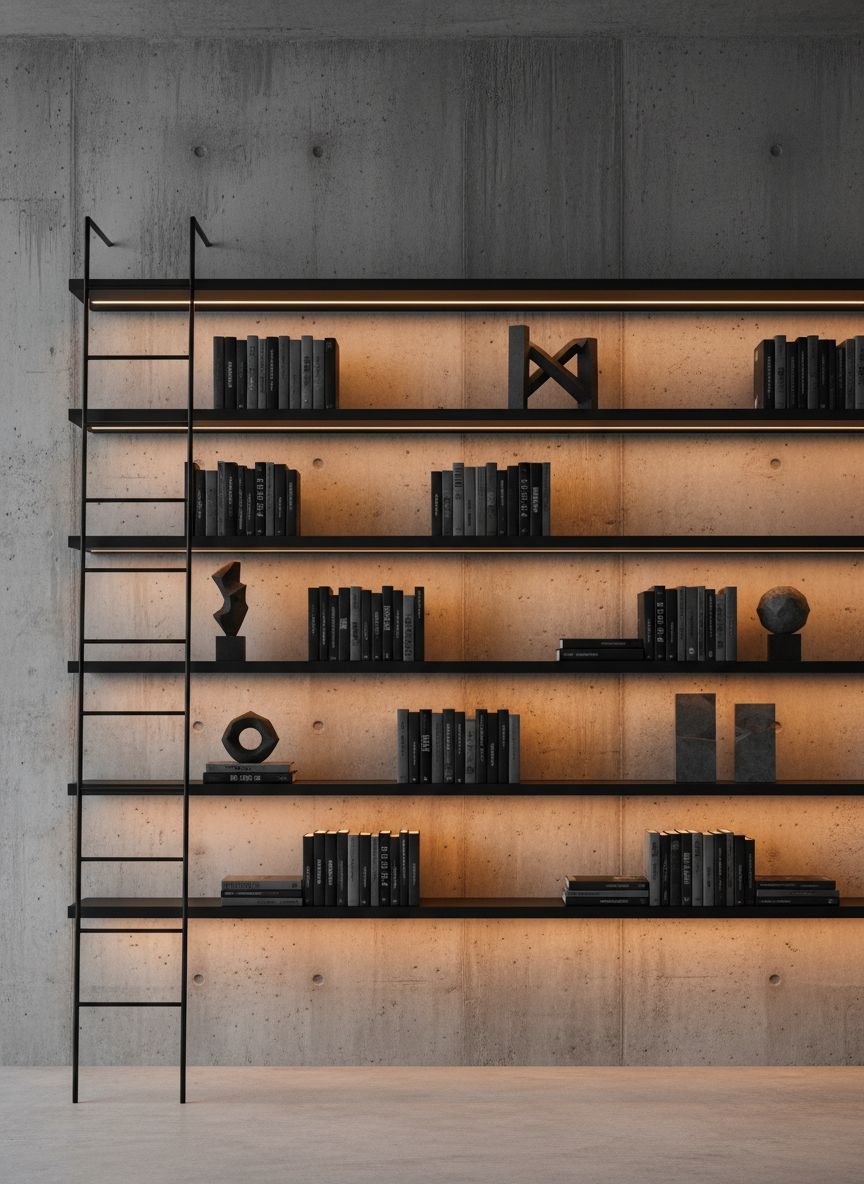 Thin metal shelving units offer a sleek and contemporary solution for modern minimalist bedrooms. Powder-coated steel or aluminum in matte black or white creates a sharp graphic line against the wall. The slim profile of the metal is incredibly strong despite its delicate appearance. These shelves are perfect for creating a “floating library” look where the books themselves become the main focus. The metal disappears visually when fully stacked with books or magazines.