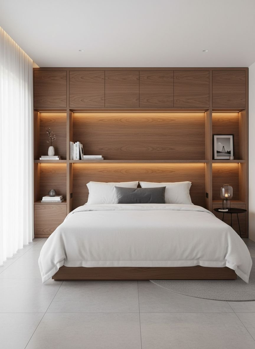 A custom headboard with integrated shelving solves the problem of limited bedside space. This design eliminates the need for bulky nightstands and keeps your sleeping area streamlined and organized. You can design the unit to extend wall-to-wall behind your bed frame to create a dramatic focal point that anchors the room. Incorporate recessed niches directly above the mattress level to hold your phone, glasses, and a glass of water. Painting the shelving unit the same color as the wall creates a monochromatic look that feels high-end and bespoke.