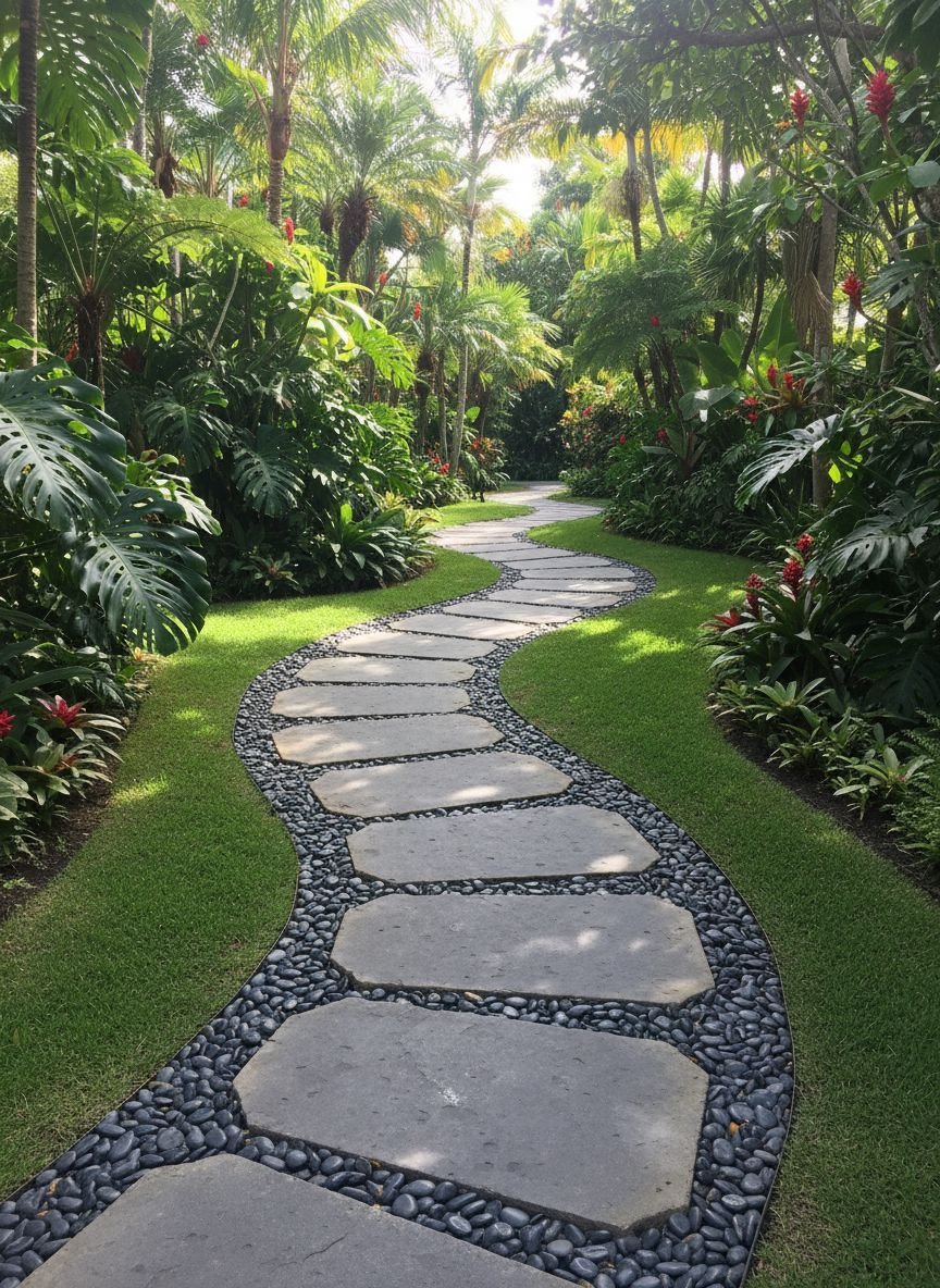 To implement this look, start by outlining your path with a flexible garden hose to get the perfect curve. Excavate the area to a depth of about 4 inches and lay down a weed barrier. Fill the base with crushed stone for stability, then top with your chosen aesthetic pebbles. Place large flagstones or pavers on top, ensuring they are level and spaced comfortably for an average stride. This design works exceptionally well in shaded areas where grass struggles to grow.