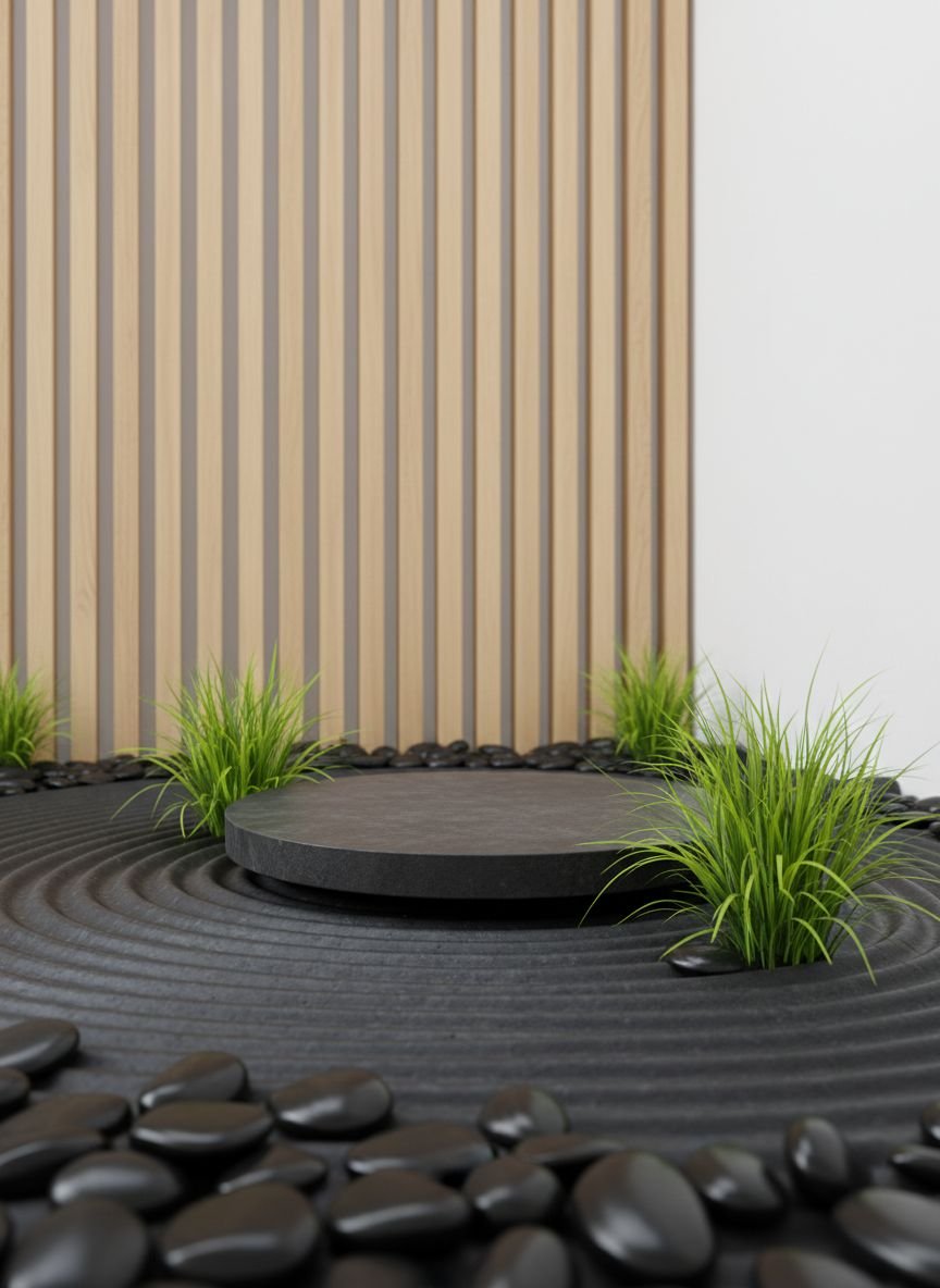 - Modern Zen Corner with Charcoal Pebble Grounding