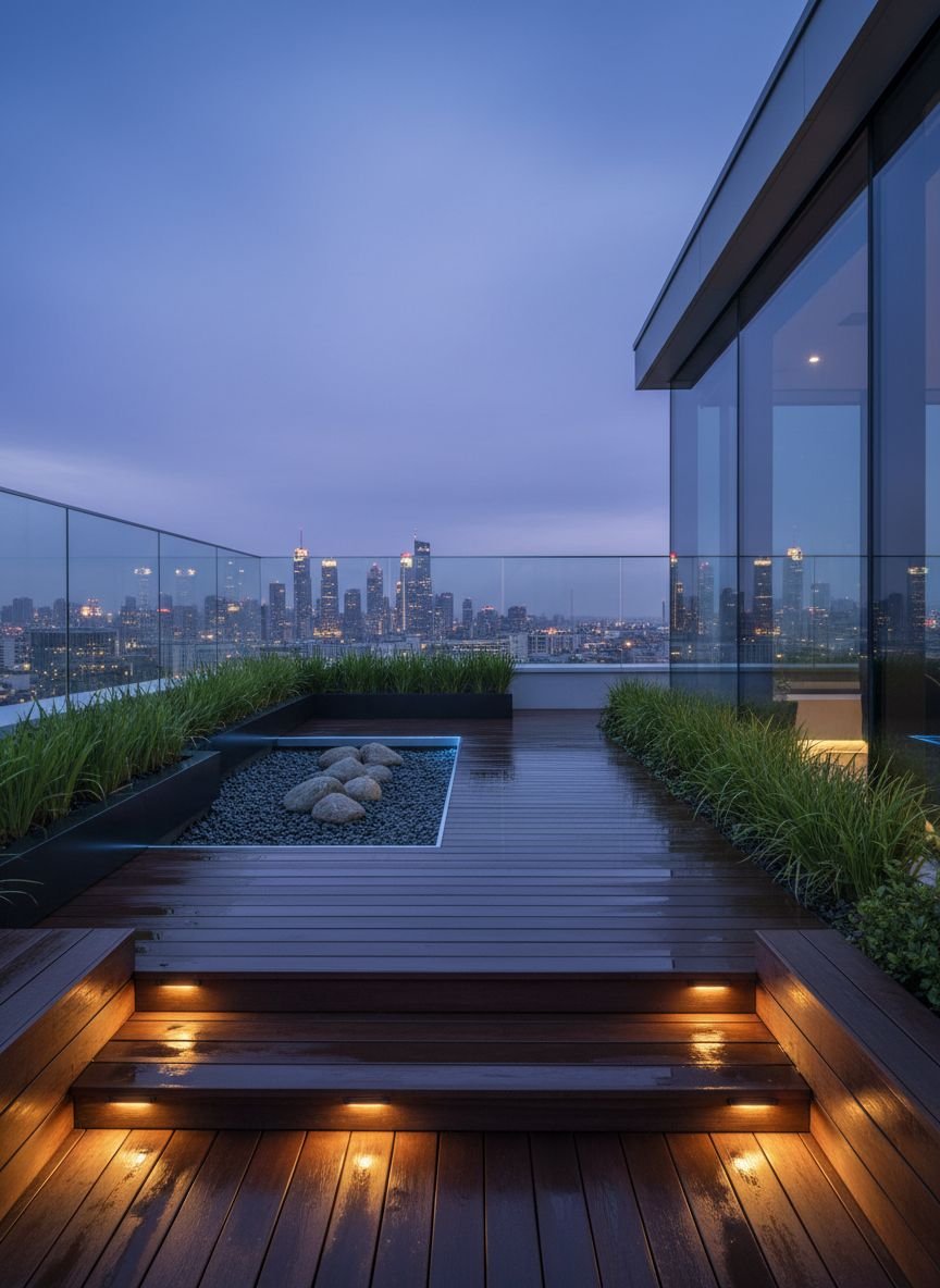- Contemporary Terrace with Illuminated Pebble Borders