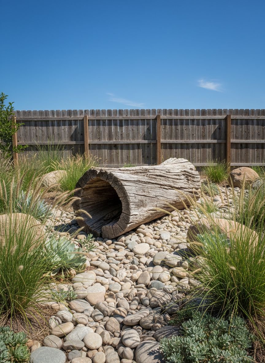Design this feature by digging a shallow trench that meanders through your yard. Line it with landscape fabric and place the largest boulders at the “bends” of the river to simulate natural erosion patterns. Fill the center with medium-sized river rocks and the edges with smaller gravel. Integrating driftwood adds an artistic, sculptural element that breaks up the stone texture. This is a perfect strategy for xeriscaping, as it requires zero water to maintain its look.