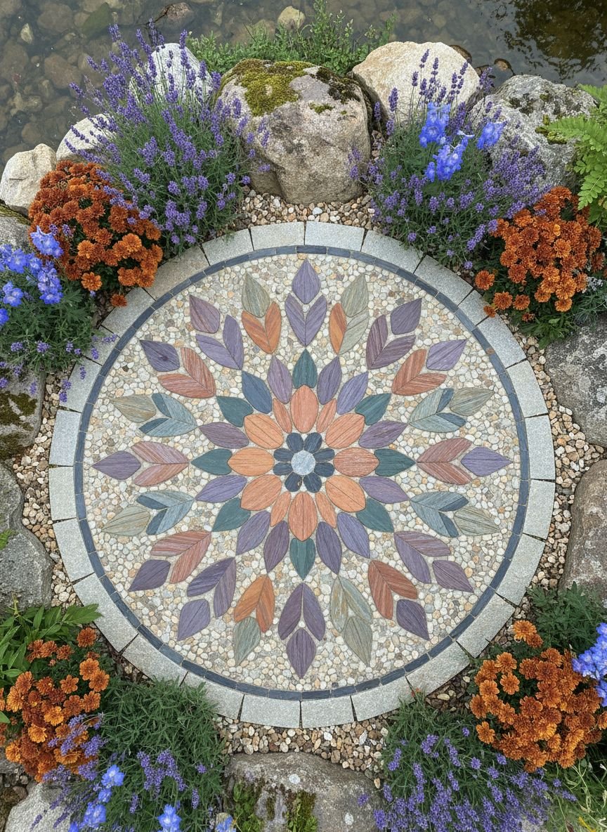 Transform a plain patch of ground into a work of art with a pebble mosaic centerpiece. This idea focuses on using stones of different colors—typically black, white, and terracotta—to create intricate patterns like spirals, flowers, or geometric mandalas. The visual impact is immediate and powerful, serving as a permanent rug for your outdoor living space. It adds a handcrafted, artisan touch that feels luxurious and bespoke.
