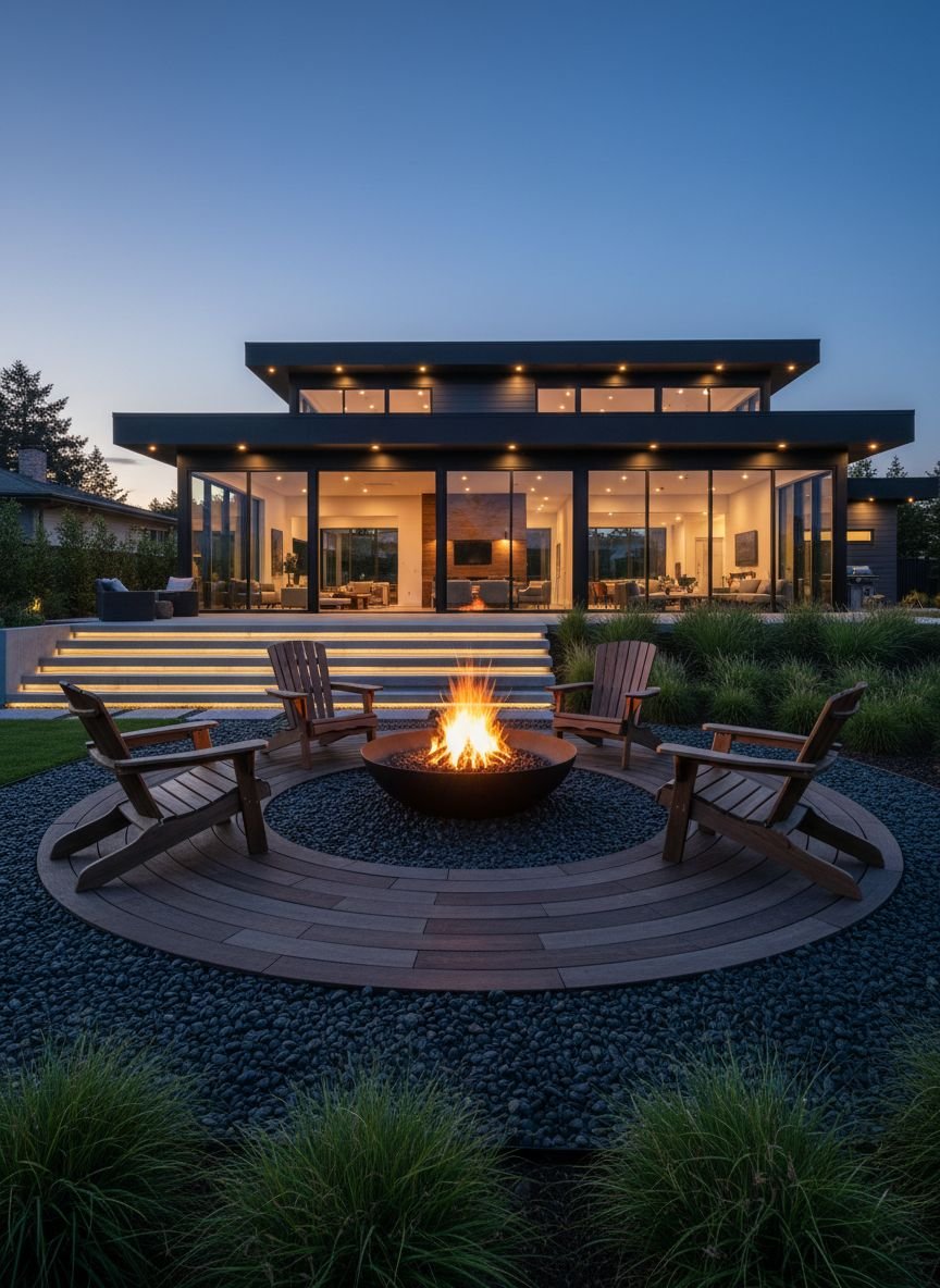 A modern fire pit area grounded by pebbles defines a cozy social zone without the need for pouring a concrete slab. The crunch of gravel underfoot adds an acoustic element that feels rustic yet refined. Visually, a base of crushed granite or pea gravel provides a neutral, fire-safe perimeter that makes the fire pit itself pop. The porous nature of the pebbles also ensures that rainwater drains away quickly, so your seating area is never muddy.